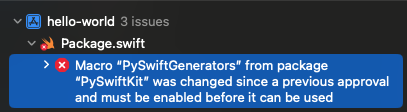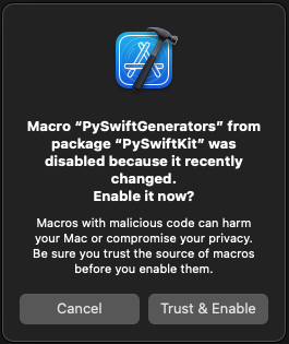 Press Ctrl+R to build and launch on the target device. The first time you run this, the build will fail with Xcode complaining about macro usage. Click in the error message and then click on Trust & Enable.